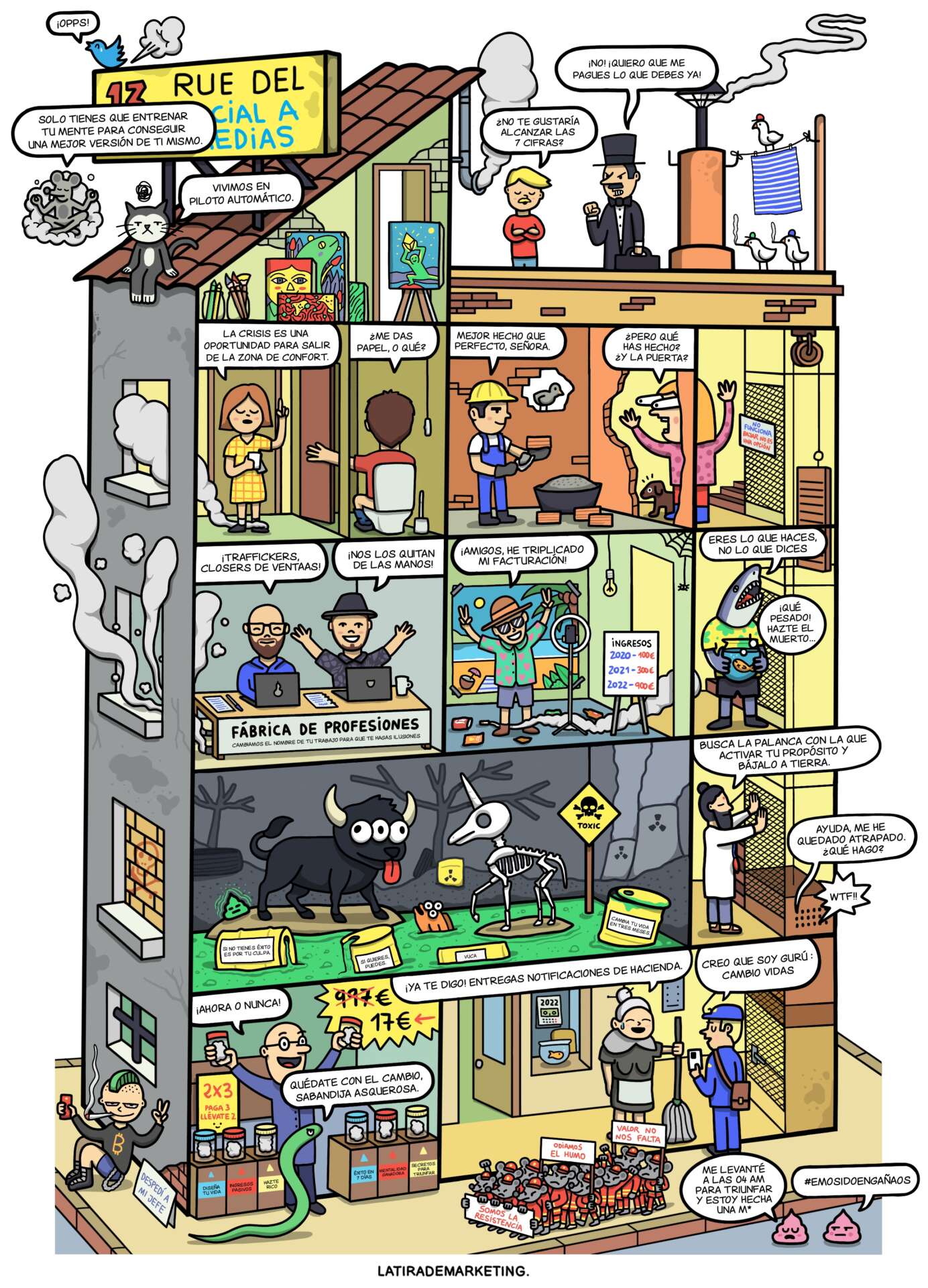 En la Rue del Social a medias huele a chamusquina. ¡Vendehúmos, gurús y tiburones han invadido el barrio! ¡Sálvese quien pueda!